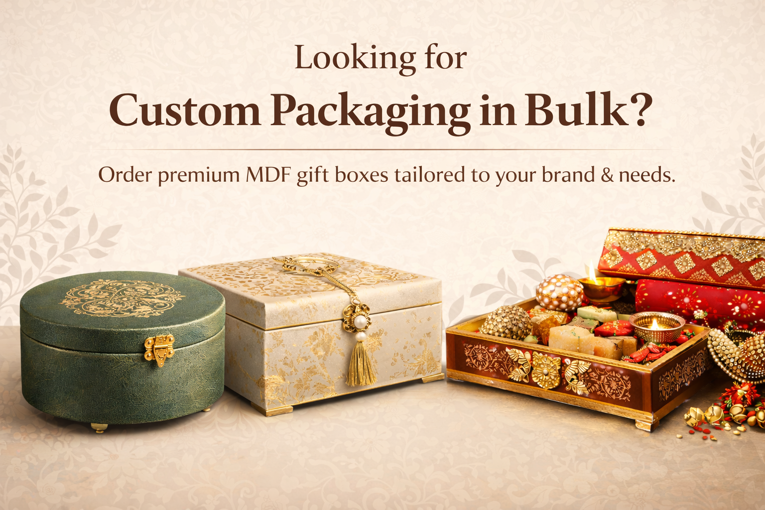 Premium MDF packaging boxes for weddings, corporate gifting & festivals. Custom designs, bulk orders & pan-India delivery.