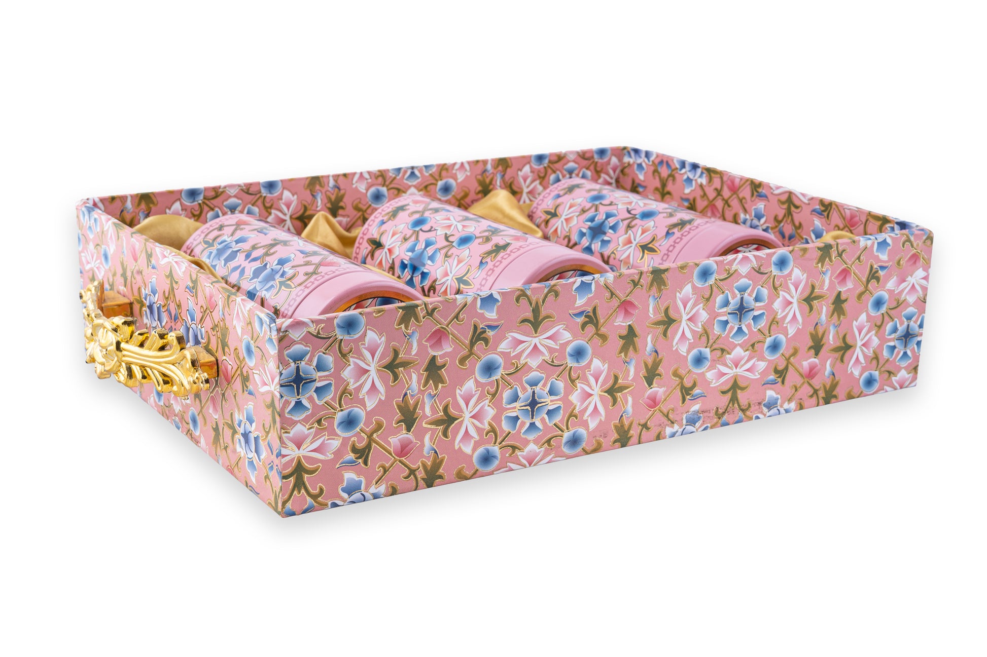 | Product Name | Premium Pink Floral Gift Box with 3 Cylindrical Jars & Gold Handle- 10 x14 x3 Inches |